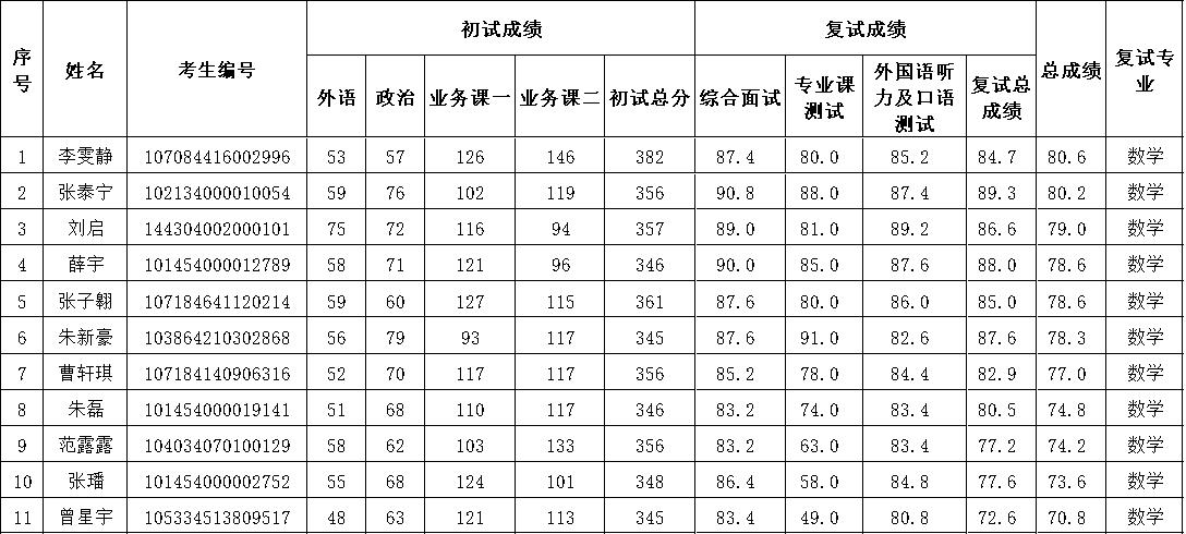 备注:复试成绩=综合面试×50%+专业课测试×30%+外语听力及口语面试×20%,复试成绩不合格(低于60分),不予录取。