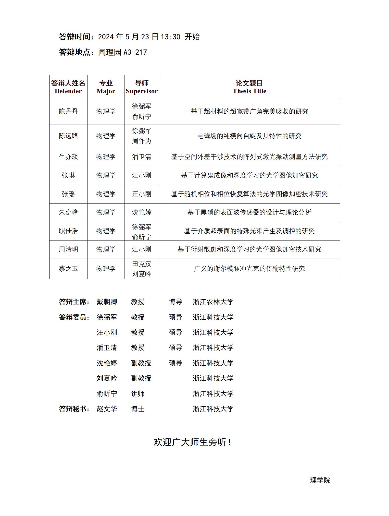 2024年浙江科技大学硕士研究生学位论文答辩公告(物理学1组)