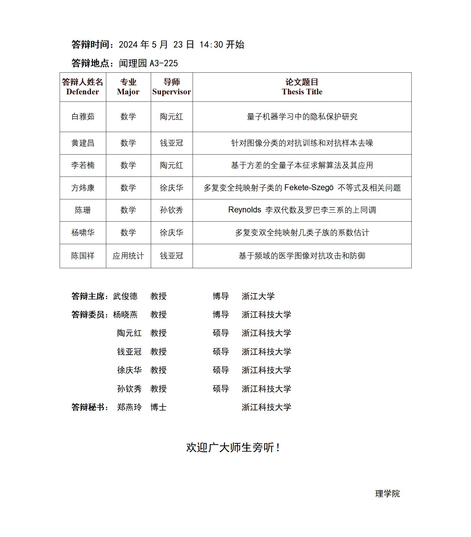 2024年浙江科技大学硕士研究生学位论文答辩公告(数学1组)