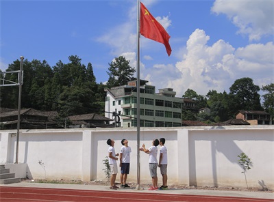 烈日炎炎下,队员们带领孩子来到学校操场进行升旗仪式,全体师生庄重肃穆,共唱国歌。升旗仪式结束后,在国旗下,孩子们宣誓:“继承遗志,发扬传统;茁壮成长,开创未来;锻炼身体,保卫祖国;好好学习,天天向上!”