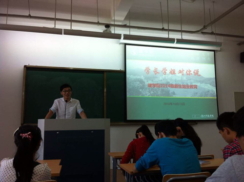 目前在Thorlabs公司任职的郑柯学长向同学们强调了大学学好高等数学的重要性,并且嘱咐大家要利用现有的资源不断提升自己。前学生会主席翁异静学姐则主要给同学们阐述如何平衡好学生工作和学习之间的关系,这对在场有意向加入学生会等社团组织的同学有了极大的启发。最后,黄世凡学长给学弟学妹们分享了他的大学生活、创业过程和个人经历,并勉励学弟学妹们珍惜大学时光,不要虚度大学四年的光阴。