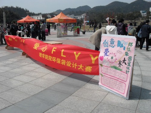 学生会宣传部和院青年志愿者协会在校圆形广场举行了以“创意DIY,爱心FLY”为主题的环保袋图案设计大赛。提醒大家“保护环境,人人有责”并不只是一句口号,而是从拒绝使用塑料袋这种不环保行为开始,敦促我们从身边的点滴小事做起,不贪图一时的便利、留下污染的后患。