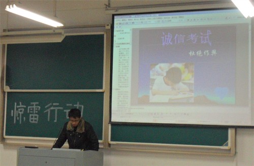 2011年1月5日,信息与计算科学101班举行了一次以“惊雷行动”为主题的班会。临近期末,很多人都很努力的复习,每天都去图书馆自习,但总有人抱着侥幸的心理,想在考试的时候动下“小聪明”。班干部就此现象特地做了有关考试作弊问题及安全问题的PPT 来劝导我们要在最后阶段更加发奋,取得好的成绩。同时让大家深刻认识到考试作弊的危害。