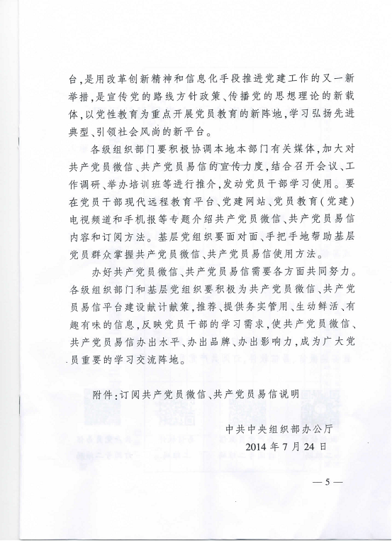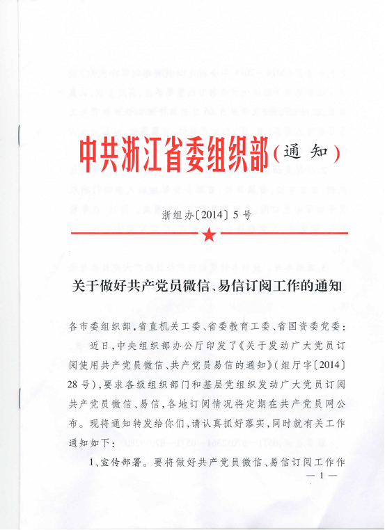 现将省委组织部《关于做好共产党员微信、易信订阅工作的通知》(浙组办﹝2014﹞5号)转发给你们,请按通知要求,发动广大师生党员根据使用习惯订阅共产党员微信或易信,并于每月23日前,将《订阅共产党员微信、共产党员易信数量统计表》报组织部(2014年10月份开始,只需报送每月新增党员订阅情况统计)。Email:[email protected]。联系电话:85070107。