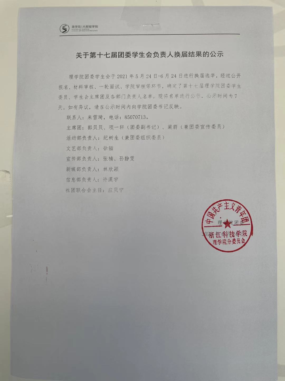 团委学生委员、学生会主席团及各部门负责人名单。现将名单进行公示,公示时间为7天。如有异议,请在公示时间内向亚洲博彩app