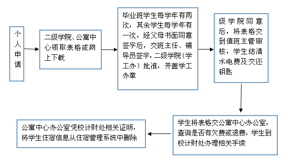 5、申请校外住宿的同学,待外住时间结束,若想继续外住或搬回学校入住,必须到后勤公司公寓中心重新办理相关手续;