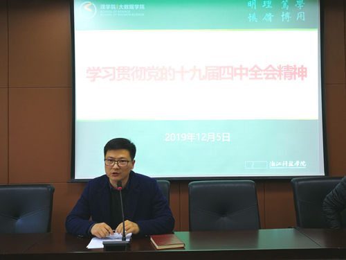 同时,王宝明传达了学校《关于认真学习宣传贯彻党的十九届四中全会精神的通知》的要求并进行部署。他指出,要提高政治站位,把学习宣传贯彻党的十九届四中全会精神作为当前和今后一个时期的重要政治任务,切实增强学习贯彻党的十九届四中全会精神的思想自觉;要把学习全会精神作为党的理论武装工作的重点任务,与“不忘初心、牢记使命”主题教育结合起来,增强“四个意识”、坚定“四个意识”、做到“两个维护”;要不断推进制度创新和治理能力建设,立足教育管理效能提升,不断增强学校办学活力,为学校高水平建设提供坚实保障。副院长钱亚冠和徐弼军也结合分管领域作了相关布置与安排。