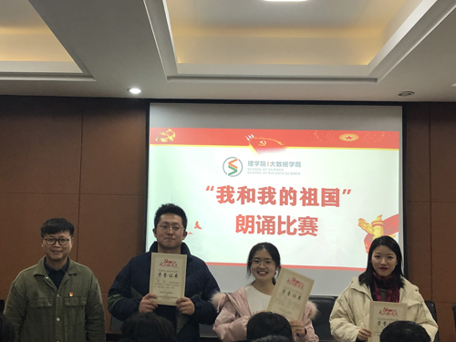 入党积极分子组队参加,由学生党员担任小队指导老师,朗诵内容以“我和我的祖国”为主题,共有9支队伍进入决赛。大家在赛前用心准备,比赛中都用饱含激情的声音和配乐把爱国、爱党、爱社会、爱人民的热情表达出来。经过激烈的比赛,最终“新青年队”的《我们的新时代》和“中国队”的《我为你骄傲,我的祖国》获得了朗诵比赛的一等奖。