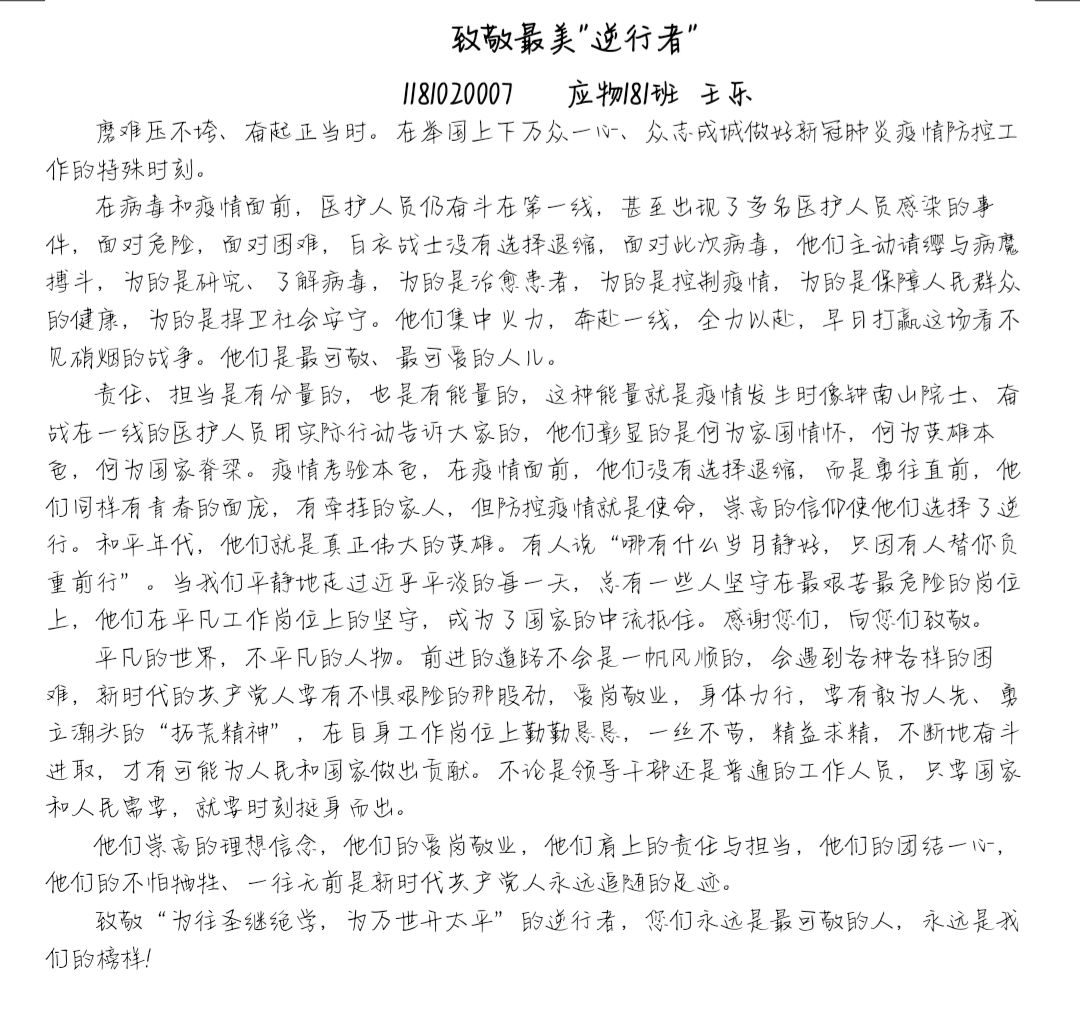 3月10日下午,应用物理学181团支部开展了线上团日活动视频会议。会议中,团支书介绍了实时疫情和防疫措施,同时对“停课不停学”的线上教学模式展开讨论,同学们积极反馈,并相互督促做好时间管理,抓好课业学习。应物181团支部进行的抗疫作品征集活动,以文章等形式表达了对抗疫工作者的敬佩和感谢,用文字书写同学们众志成城、齐心协力抗击疫情的信心和决心。