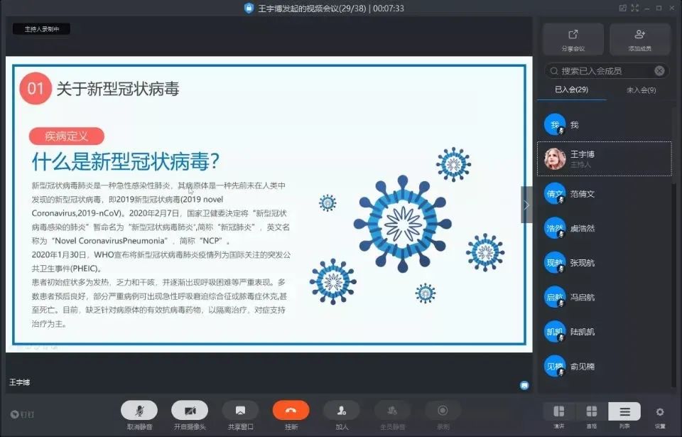 活动伊始,团支部成员共同观看了预防新型冠状病毒和一线战“疫“医护人员的视频,身处湖北疫区的同学也有感而发,为大家进一步介绍当地疫情,让大家正确认识疫情发展。随后班级同学在线上进行关于预防新型冠状病毒的知识问答,从而普及防控知识,提高同学们的防护能力,活动中同学们踊跃抢答,气氛活跃。最后,信计181团支部通过投票选出团支部抗疫口号——“齐心协力抗疫情,大学青年话担当”,并进行抗疫宣誓。