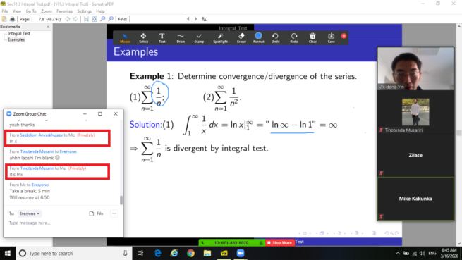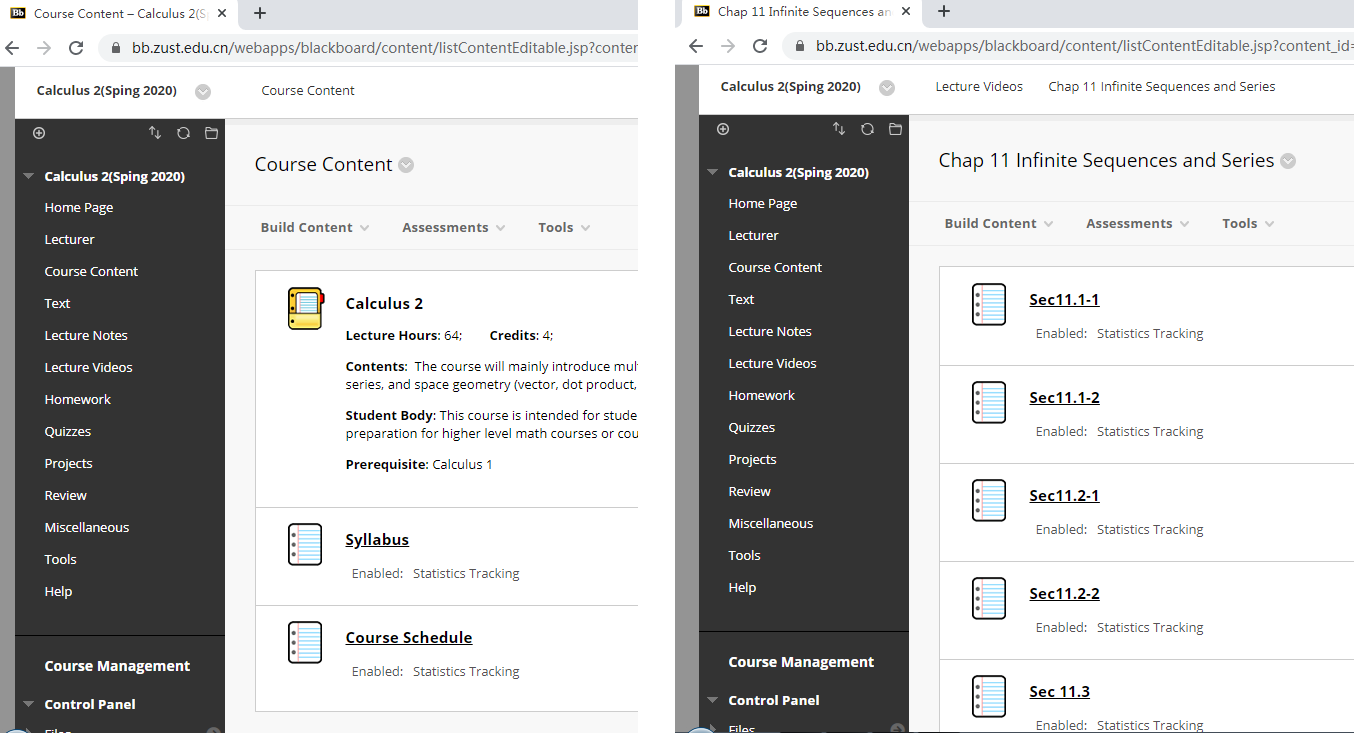 在教师方面, Calculus 2的课,我用的是Blackboard平台. 平台本身不错, 但是校园网的防火墙极度粗糙的过滤方式, 严重影响师生正常工作、学习(尤其是开学第一、二周问题最严重). 经常出现的情况是,我在正常更新课程网站,突然校园网把我屏蔽了;我在正常改学生线上作业,输入评论,校园网把我屏蔽了;我在上传课程视频,校园网把我屏蔽了;有的国际学生想要登陆平台做作业,校园网把他屏蔽了…….对此问题, 向学校反映过多次(比如, 学校第一周网课的调查反馈表,我填了2次,反映这个问题);教务处的贾瑾老师,还有Blackboard的客服肖禾佳,都非常负责,给了我很多帮助.