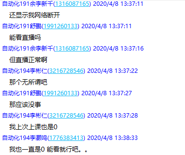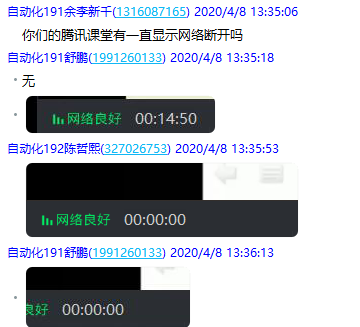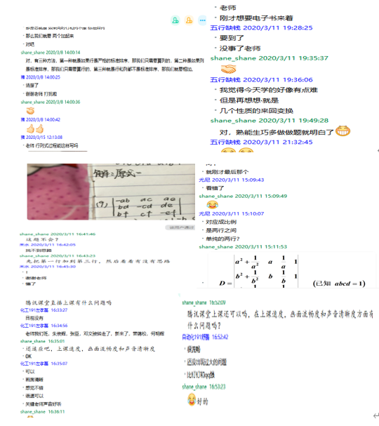 到目前为止多数学生反映使用腾讯课堂上课效果特别好,直播过程稳定,不会出现卡顿、失声、断网等情况,课下还有历史课程可以回放,甚至部分同学认为腾讯课堂要优于钉钉和QQ群直播。而QQ群又提供了一个可以和老师一对一教学的良好平台,方便学生提问也方便老师答疑解惑,可以进一步促进本课程的教学。