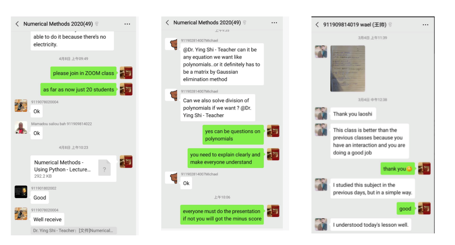 留学生教务(如潘贺、朱凡老师等)的热心及时的帮助下,忐忑的心有所放下。因为于2月19日开始,利用10天左右的时间通过微信群成功地联系到了班上的46名学生,同时将37名学生顺利迁移到了ZOOM教学平台,对于没有联系到的2位学生和没有迁移到ZOOM平台的学生,在留管中心老师的帮助下,搞清楚了原因(已办理退学5名,4名回国网络差无法用ZOOM)。于2月24日开始直至3月3日(第一次课的前一天),通过微信群,指导学生如何利用ZOOM进行在线上课、反复告知学生上课的时间等。以争取最大限度地线上教学硬件资源的充分准备。