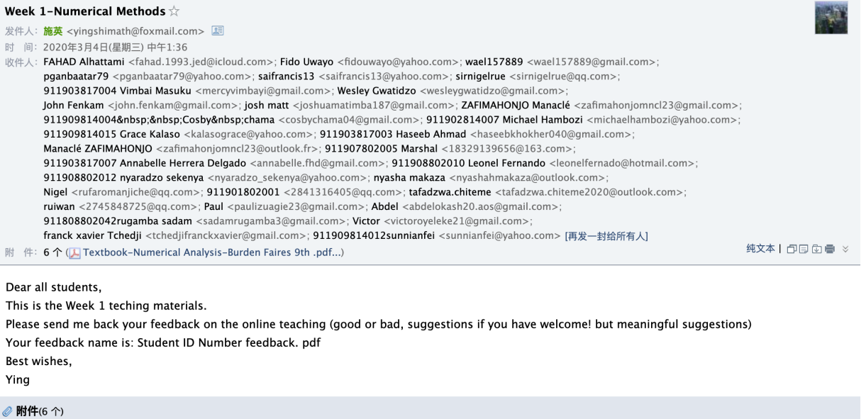 通过上课实践发现,对于不在中国的学生,无法使用百度网盘下载资料,故改为用Email进行教学资料的发送,学生作业、随堂测试的上交和返还。共享的教学资料,包括:电子化教材,课件讲义和PPT,教师录制的知识点教学短视频,作业和测验习题答案,电子化教学直播过程中的公式推导笔记等。