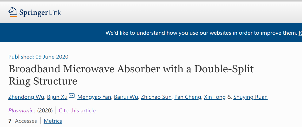 近日, 2017级应用物理学本科生吴震东同学在徐弼军老师指导下以第一作者身份在国际知名期刊《Plasmonics》(IF=2.926,中科院三区)发表了一篇高质量学术论文,这是他们在超材料的吸收损耗特性最新研究成果。论文的通讯作者是徐弼军教授,并以浙江科技亚洲博彩app