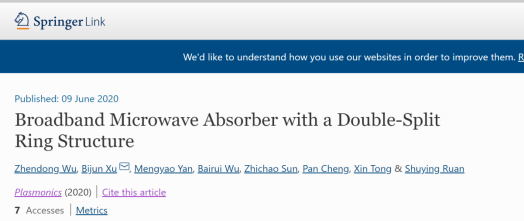 2017级应用物理学本科生吴震东同学在徐弼军老师指导下以第一作者身份在国际知名期刊《Plasmonics》(IF=2.926,中科院三区)发表了一篇高质量学术论文,报道了他们在超材料的吸收损耗特性最新研究成果。浙江科技亚洲博彩app