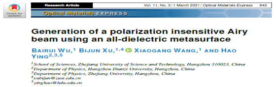 应用物理系2019级研究生吴白瑞同学在徐弼军指导下以第一作者身份在美国光学学会旗下的国际知名学术期刊《Optical Materials Express》(影响因子3.064,中科院二区)上发表一篇高质量学术论文,报道了他们在超构表面产生特殊光束的最新研究成果。浙江科技亚洲博彩app