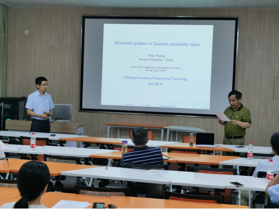 黄勇教授首先介绍了高斯概率空间中的Minkowski问题的研究背景,以及在解决过程中,如何利用Aleksandrov的变分思想,最后介绍了如何利用PDE的度理论给出光滑解,然后利用逼近方法得到其弱解的方法。黄勇教授的报告深入浅出,通俗易懂,非常精彩。