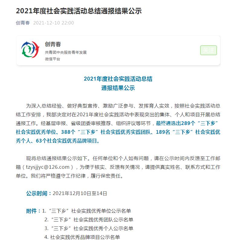 为深入总结经验、做好典型宣传、激励广泛参与、发挥育人实效,按照社会实践活动总结工作安排,共青团中央青年发展部决定对在2021年度社会实践活动中表现突出的集体、个人和项目开展总结通报工作。