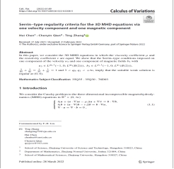 在论文2中,陈辉博士和合作者研究三维不可压缩磁流体方程。利用Caffarelli-Kohn-Nirenberg引入的适当弱解理论,首次得到了解关于一个速度场分量和一个磁场分量的爆破准则。