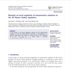 在论文1中,陈辉博士和合作者研究了三维不可压缩Navier-Stokes方程的轴对称解。事实上,通过改进旋量方程的De Giorgi-Nash-Moser迭代,得到了轴对称解一般的超临界爆破准则。该结果是陈辉博士和合作者在2017年发表在《Archive for Rational Mechanics and Analysis》等一系列工作的延续。