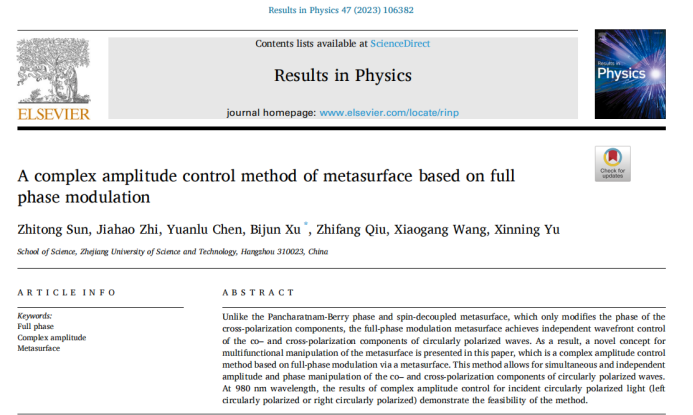 光子与光场调控及应用研究团队中2020级研究生孙志通以第一作者身份在《Results in physics》 期刊上发表了题为“A complex amplitude control method of metasurface based on full phase modulation”的创新研究文章。浙江科技亚洲博彩app