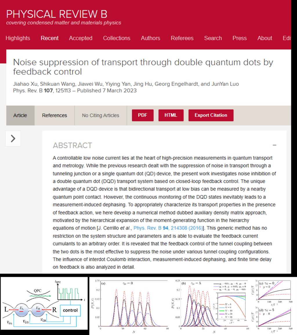 应用物理系量子信息物理研究团队中2020级研究生许佳昊同学以第一作者在国际权威物理学术期刊《Physical Review B》上发表了题为“Noise suppression of transport through double quantum dots by feedback control”的研究论文,浙江科技亚洲博彩app