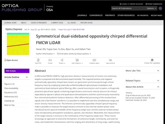 应用物理系光子与光场调控研究团队在FMCW激光雷达研究方面取得重要进展,相关研究成果以论文形式发表在国际光学领域知名期刊《Optics Express》(影响因子3.8,中科院SCI二区,JCR Q1)上。论文题为“Symmetrical dual-sideband oppositely chirped differential FMCW LiDAR”,职亚楠为论文第一作者/通讯作者,研究生孙玉娇为第二作者,浙江科技亚洲博彩app