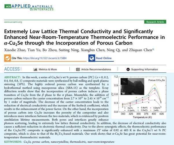 量子关联物质研究团队青年博士赵小蝶在半导体热电材料领域取得重要进展,研究成果发表在《ACS Applied Materials & Interfaces》(IF=9.5,中科院二区TOP),论文题目为“Extremely Low Lattice Thermal Conductivity and Significantly Enhanced Near-Room-Temperature Thermoelectric Performance in α-Cu2Se through the Incorporation of Porous Carbon”。浙江科技大学为第一单位,青年博士赵小蝶为第一作者,武汉大学陈志权教授为通讯作者。本研究得到了国家重点研发计划项目、国家自然科学基金、浙江科技亚洲博彩app
