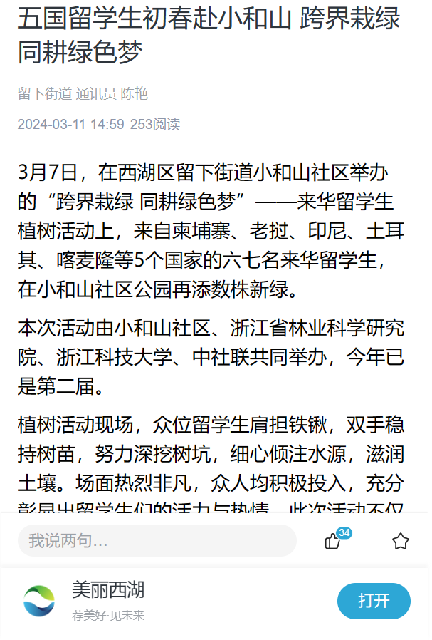 此次活动不仅受到了美丽西湖客户端的报道,还在劳动中增进中外学生彼此的友谊,同时唤起了社区居民及浙科学子对自然生态及绿化建设的重视。(学工办 张炜 蔡瑞康)
