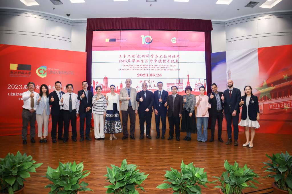 在仪式上致辞,希望同学们继续做中法文化交融的杰出使者,祝愿所有毕业生前程似锦、鹏程万里!此外,法国高等教育署上海中心负责人、高等教育合作副专员南子跃(Olivier Perez)以及法国高等教育署杭州办事处负责人耿雪婷出席此次典礼。典礼最后,项目学生与法国外教共同合唱法语歌曲,赢得了全场的热烈掌声和喝彩。