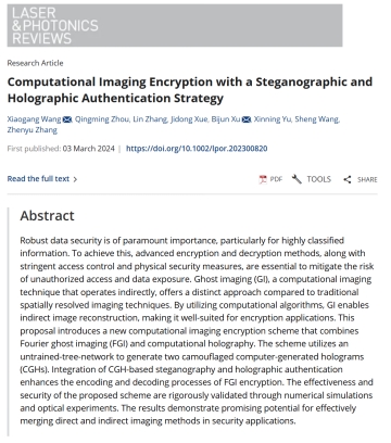 光子与光场调控研究团队在光信息安全处理研究领域取得重要进展,相关研究成果以“Computational Imaging Encryption with a Steganographic and Holographic Authentication Strategy”为题,发表于光学领域国际顶尖期刊《Laser & Photonics Reviews》(影响因子11,中科院1区Top),并被选为当期的扉页论文(Frontispiece)高亮推荐。汪小刚教授、物理系2021级硕士研究生周清明为本文的共同第一作者,汪小刚教授、徐弼军教授为论文的共同通讯作者。浙江科技大学为论文第一单位。该研究工作得到了国家自然科学基金的资助。