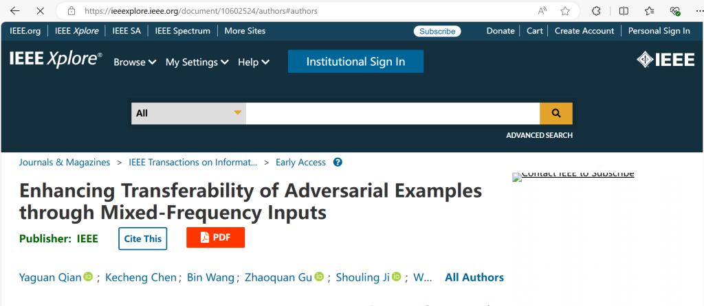 大数据与人工智能安全研究团队的论文“Enhancing Transferability of Adversarial Examples through Mixed-Frequency Inputs”在IEEE Transactions on Information Forensics and Security (TIFS)发表。该期刊同时为中科院1区TOP,中国计算机学会(CCF)A类期刊,中国密码学会(CACR)A类期刊,清华大学A类期刊,是信息安全领域最具影响力的国际顶级刊物之一。论文以我校为第一单位,钱亚冠教授为第一作者,22级研究生陈科成为第二作者,与全省智能物联网络与数据安全重点实验室、浙江大学、哈尔滨工业大学、西安交通大学、澳洲维多利亚大学等单位的研究人员合作完成。