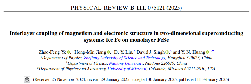 应用物理系量子关联物质研究团队在国际学术期刊《Physical Review B》 (IF=3.71,中科院二区) 期刊上发表了题为“Interlayer coupling of magnetism and electronic structure in two-dimensional superconducting systems: fcc Fe on monolayer FeSe”的研究论文。浙江科技大学为第一单位,论文第一作者为物理学硕士研究生叶兆丰,导师黄衣娜副教授为通讯作者。文章致谢了浙江大学林海青院士和加州大学戴维斯分校的Warren E. Pickett教授。此项研究获得国家自然科学基金和浙江省自然科学基金的资助。