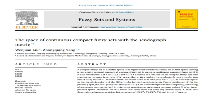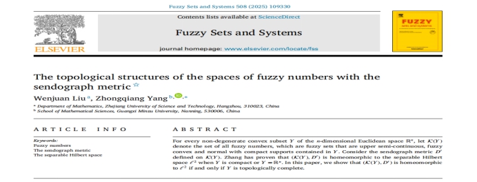 代数与模糊数学团队刘文娟博士与合作者在模糊数学国际权威期刊《Fuzzy Sets and Systems》(中科院一区top期刊)上连续发表3篇学术论文,系统深化了模糊度量空间理论的研究。研究成果以浙江科技大学为第一单位,刘文娟博士为第一作者,三篇论文分别为: