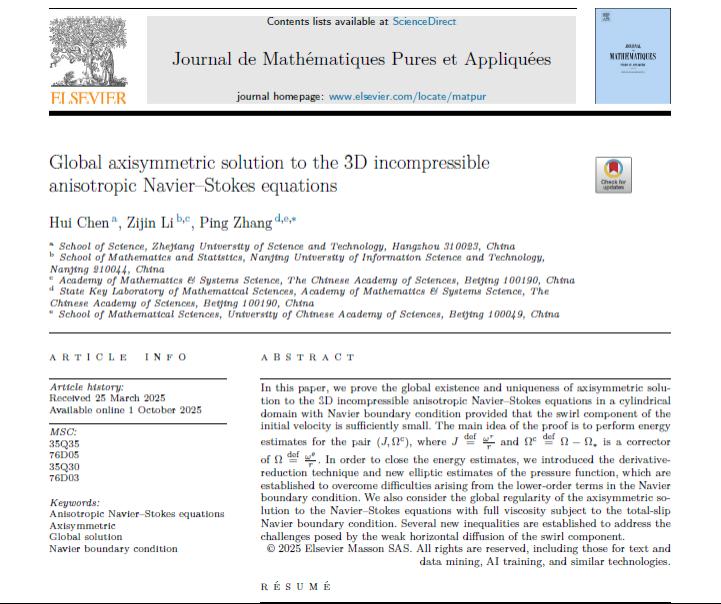 非线性偏微分方程团队陈辉副教授与合作者在Navier-Stokes方程组的解的相关研究中取得系列重要进展,其成果发表在数学领域顶级期刊《Journal de Mathématiques Pures et Appliquées》(简称JMPA,中科院一区Top)及《International Mathematics Research Notices》(简称IMRN,中科院二区)。研究成果均以陈辉副教授为第一作者,浙江科技大学为第一完成单位,研究工作得到了国家/省自然科学基金的资助。成果简介如下: