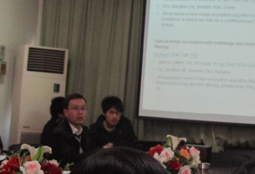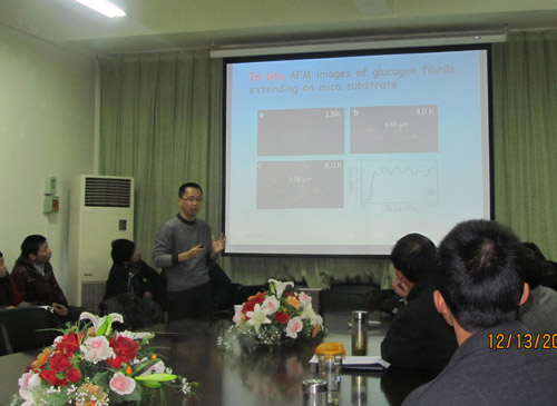 12月13日下午,亚洲体育博彩平台 物理系“格致论坛”第十六讲在A4-222会议室举行。宁波大学周星飞博士和浙江农林大学汪小刚博士应邀为论坛作学术交流报告。报告会由物理系主任王长荣教授主持,物理系、实验中心相关教师和应用物理学部分高年级学生参加了本次论坛。 会上,汪小刚博士、周星飞博士分别就“光学图像的编码及隐藏”、 淀粉样多肽聚集的原子力显微镜研究作了专题报告,介绍了自己近年来在该的相关研究成果,并和与会师生就相关专题进行了讨论。