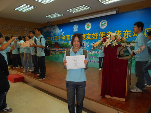 的唯一一名代表,随浙江省代表团参加培训,并获由国家环境保护部授予的“青年环境友好使者”称号。