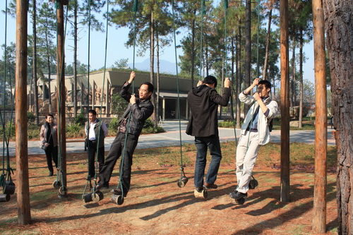 竹博园里,清风摇曳,竹影婆娑,园内遍植各类竹子400余种。置身其间,仿佛走进竹的海洋,它们有的伟岸凌空,有的低矮匍匐;有的细如棒针,有的叶大如帛;有的色彩斑斓,有的古怪扭曲。大家观赏完各种竹子后,又观赏了鸟艺表演和镇园之宝——大熊猫。游览之余,大家还兴致勃勃的玩起了赛车、蹦极、荡桥等活动。
