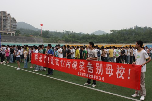 6月24日,学校在运动场隆重举行了2009届毕业典礼。在典礼现场的毕业生队伍中,一条红色横幅格外引人注目,上面写着:再见了!让我们用微笑告别母校!这是亚洲体育博彩平台